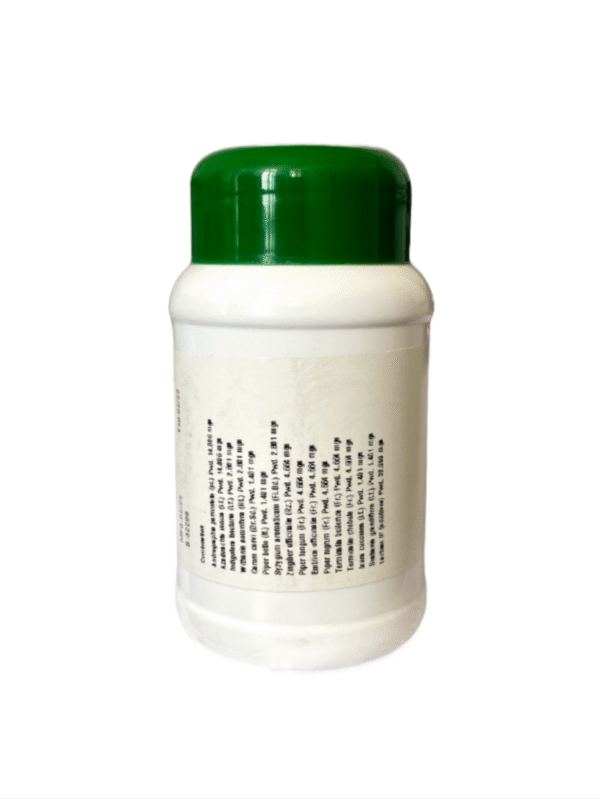 Andrographis Paniculata, Azadirachta Indica, Indigofera Tinctoria, Withania Somnifera, Carum Cravi, Piper Betle, Syzygium Aromaticum, Zingiber Oficanlis, Piper Longum, Emblica Officinalis, Piper Nigrum, Terminalia Bellerica, Terminalia Chebula, Ixora Coccinea, Sesbania Grandiflora, Lactose.
