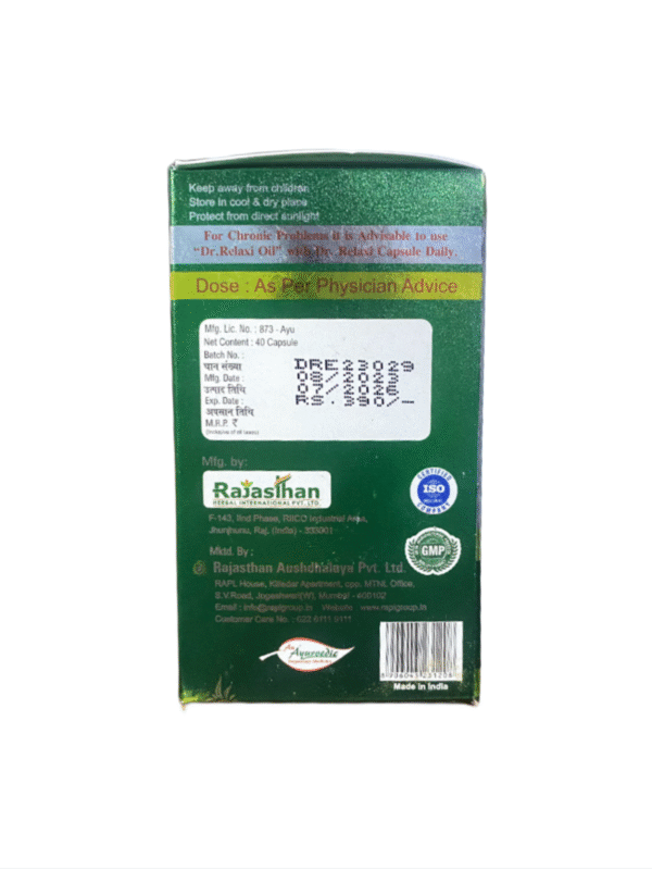 Dr. RELAXI Capsule is made with the Composition Of Maharasnadi Ext, Amalaki Rasayana Pdr, Withania somnifera, Vitex negundo, Trigonella foenum – graecum, etc, to helps to promote Ortho Care.