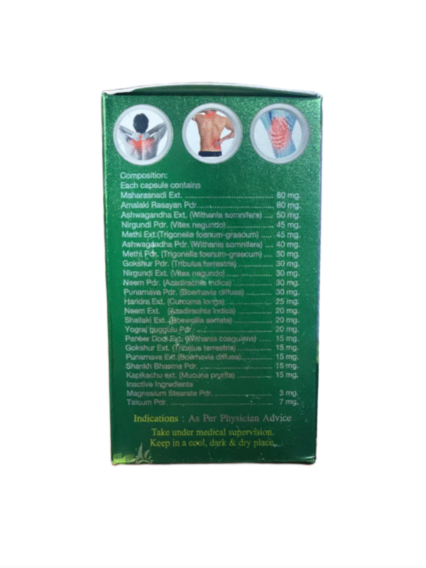 Maharasnadi Ext, Amalaki Rasayana Pdr, Withania somnifera, Vitex negundo, Trigonella foenum – graecum, Tribulus terrestris, Azadirachta indica, Boerhavia diffusa, Curcuma longa, Boswellia serrata, Yograj Guggulu Pdr, Withania coagulens, Tribulus terrestris, Boerhavia diffusa, Shankha Bhasma Pdr, Mucuna prurita, Preservatives
