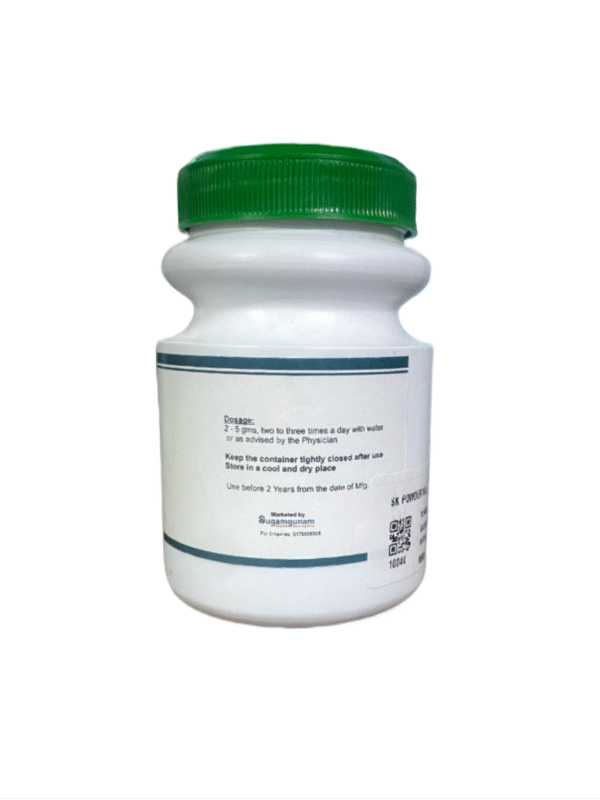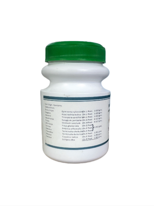 SK Chooranam is made with the Composition Of Gymnema Sylvestre, Azacirachata Indica, Tinospora Cordifolia, Syzygium Jambolanu, Ocimum Sanctum, Ficus Glomerata, Emblica Officinalis, etc,. to helps to promote Diabetic Care.
