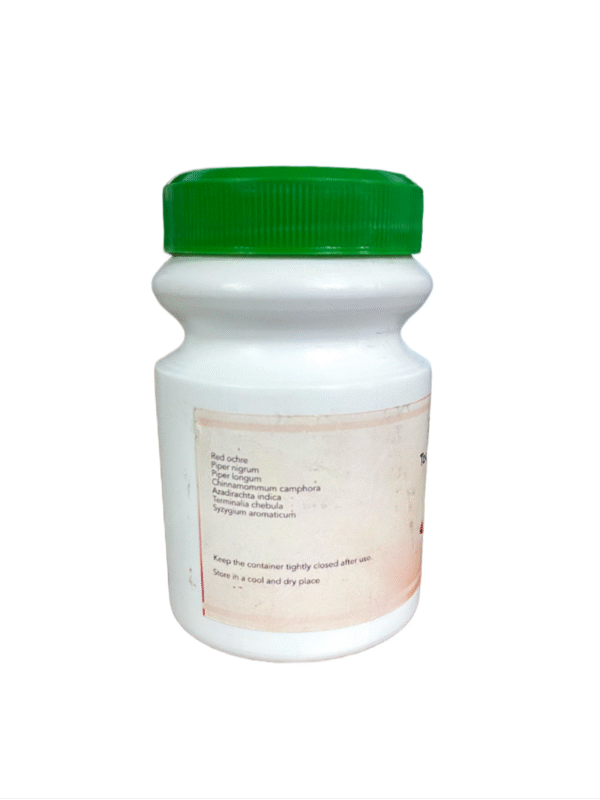 Red Ochre, Piper Nigrum, Piper longum, Cinnamomum Camphora, Azadirachta Indica, Terminalia Chebula, Syzygium Aromaticum.
